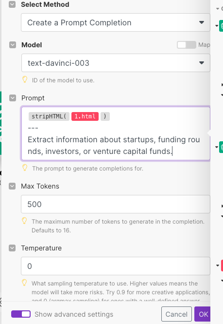 We can allow AI models to be more random or make them deterministic using the temperature parameter. What is the right value? It depends on what we want to achieve. If we wanted the model to generate an email, we would prefer to make it less deterministic and more creative. Hence, we would set a higher temperature value. However, when we use the model to control automation or extract data, we want the same output every time we send the same input. Therefore, all of the AI interactions in this example have temperature set to 0.